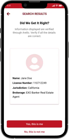 We take your trust seriously. That’s why every real estate agent on our platform is verified through Arello, the leading database for real estate license authentication.